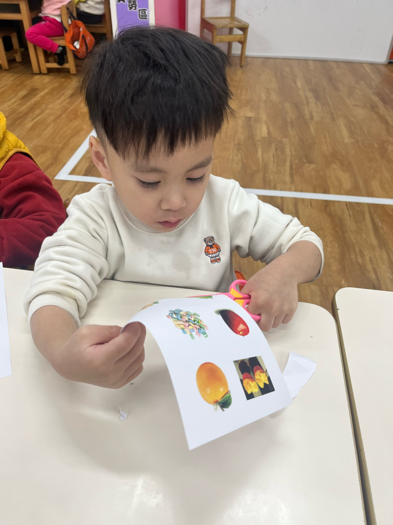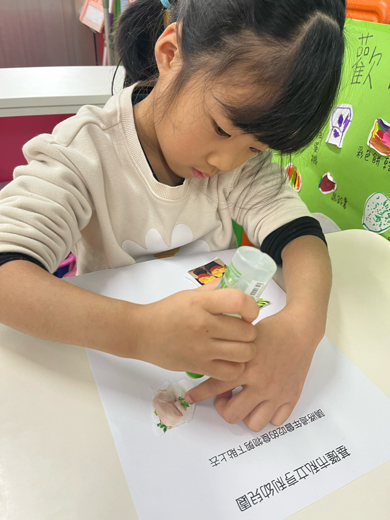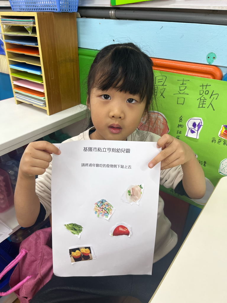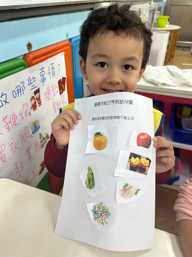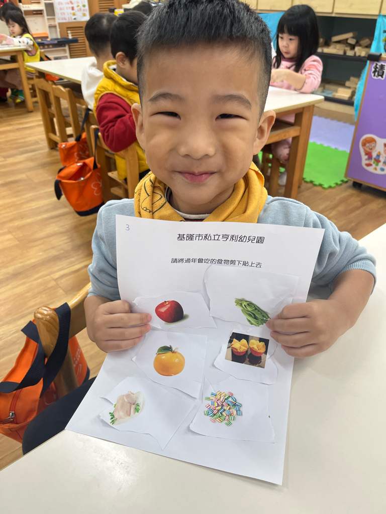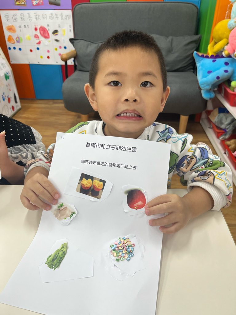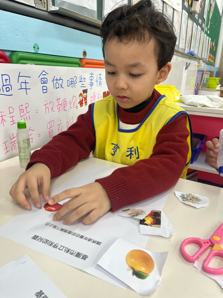 剪貼過年會吃的食物(使用圓頭的安全剪刀練習剪紙,訓練精細動作及開合動作)